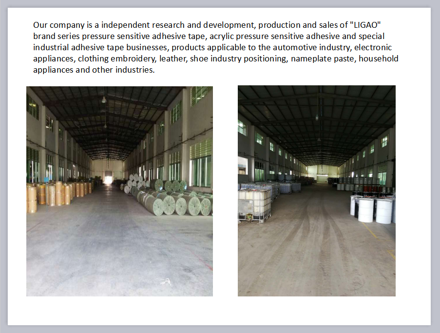 Jiangmen City Ligao New Material Technology Co., LTD is a private enterprise which was established in 2004, integral plant is located in Lianfeng industrial zone. At the initial stage we mainly focus on producing, processing and selling pressure sensitive glue.